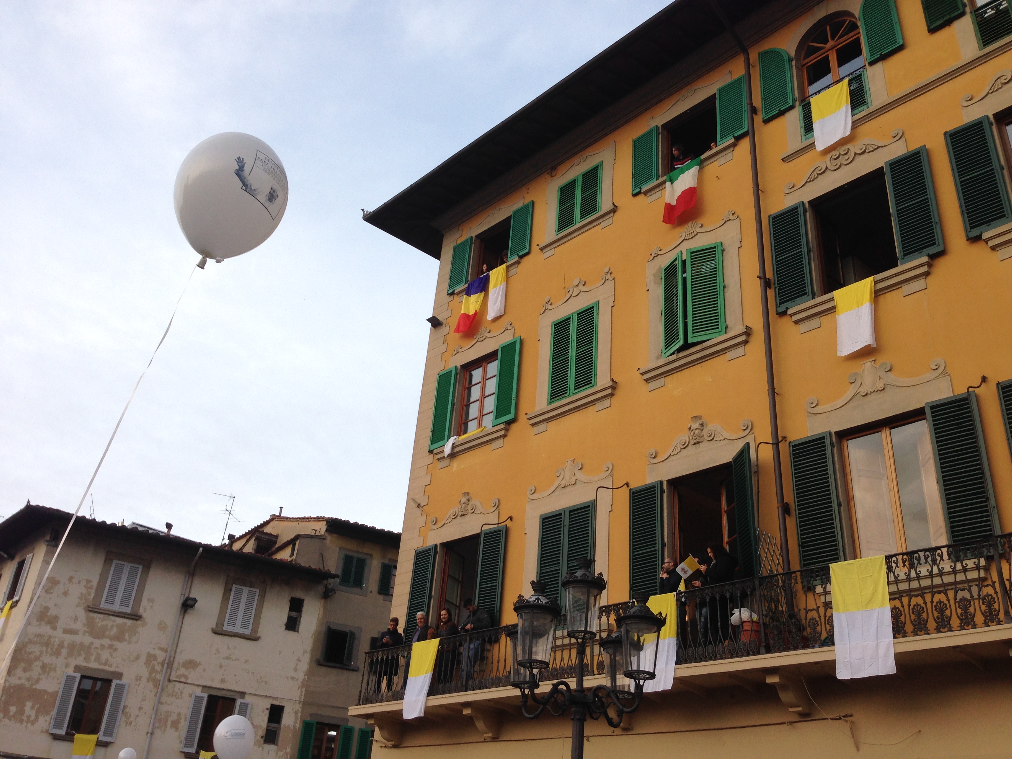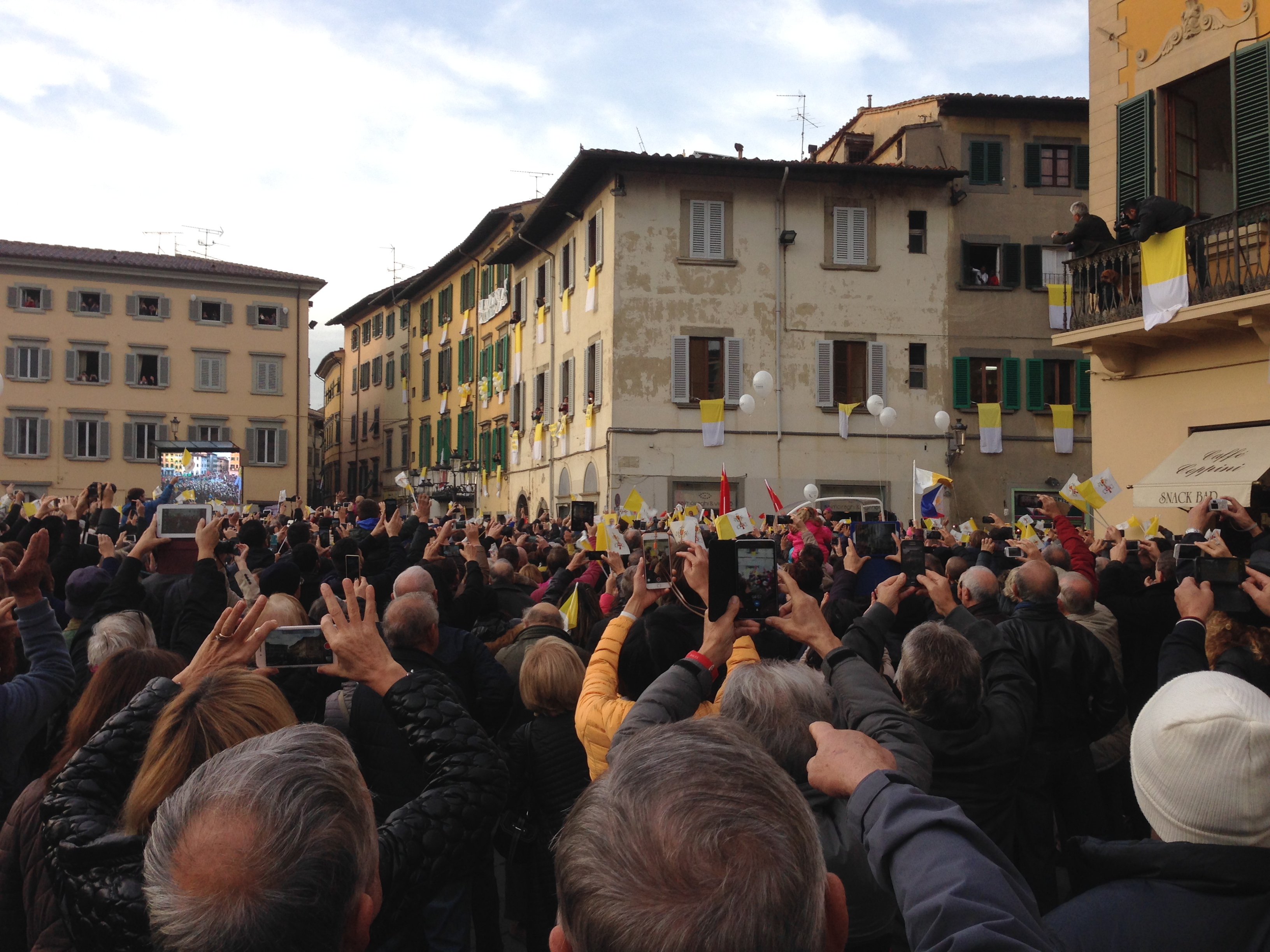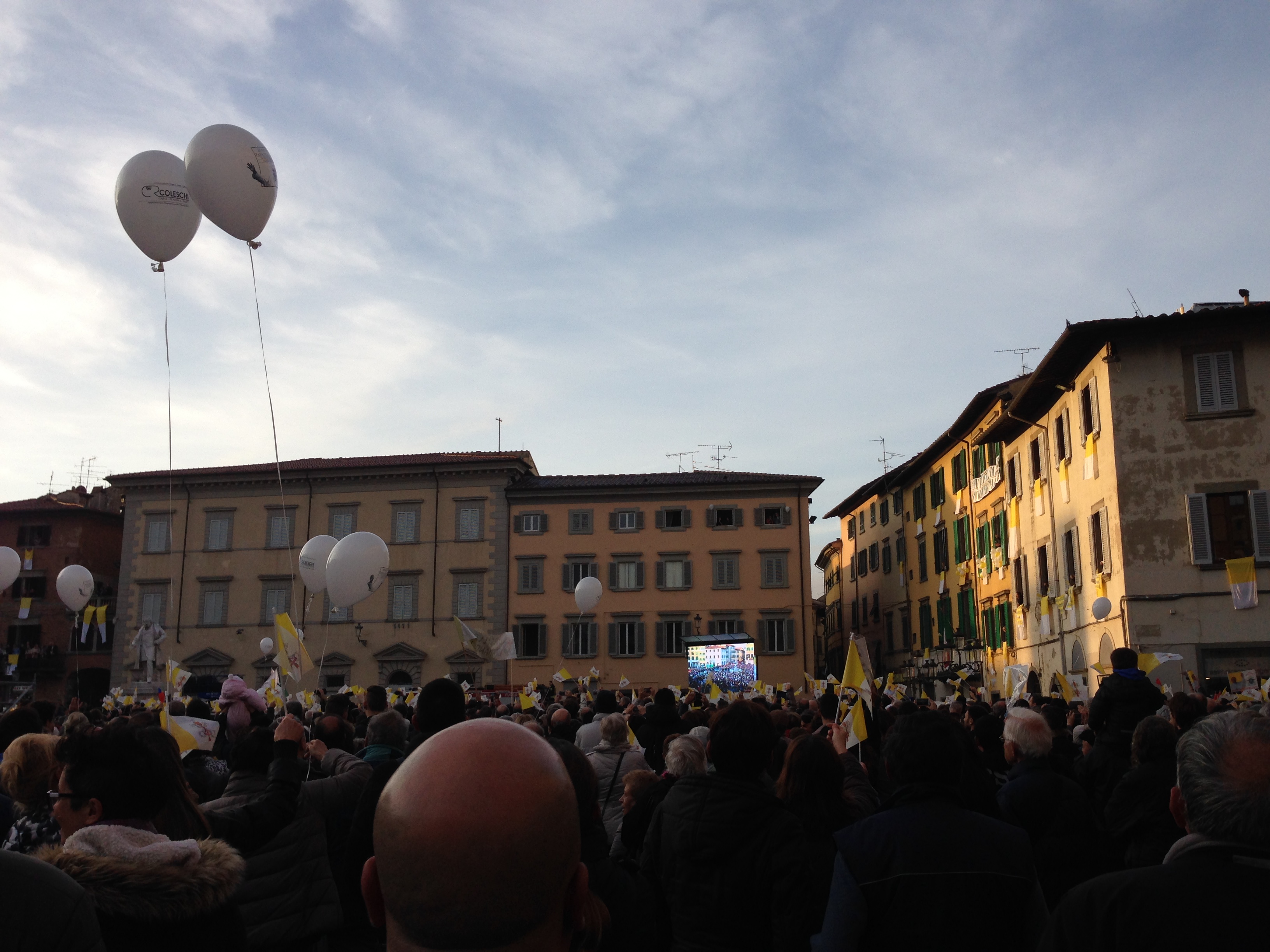 The day of the visit, everyone in the city seemed to be up before the sun, everyone was swarming towards the city center and onto the Piazza del Duomo before it was even 7 am. Slightly confused but all the more excited kids, weakish looking old couples supporting each other, surprisingly tipsy ladies in their fifties who seemed to love being back to the days where you could shamelessly “WOOOO” at a celebrity like a teenager – everyone was gathering in the piazza, waving Vatican flags and holding onto balloons with not only a huge company logo on them, but also the ever-smiling portrait of the Holy Man.