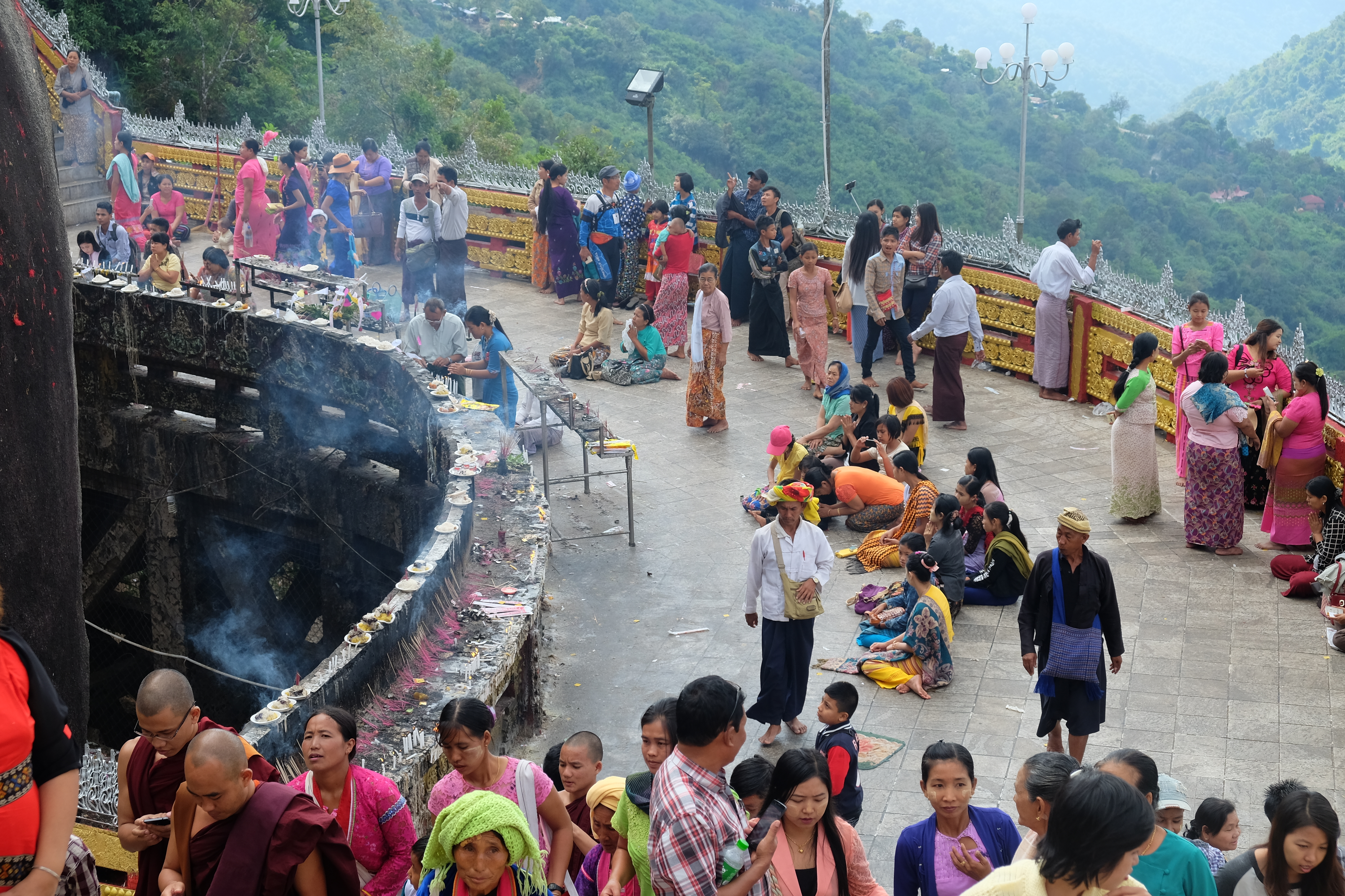 I have to admit that I had no idea what to expect up there apart from the actual gravity defying rock – but I was still so surprised when I found the place to be such a busy, crowded pilgrimage camp really. There were restaurants and shops everywhere, people selling devotional objects, others offering to carry old or weak pilgrims in palanquins (or tourists made from money), whole families bustling along clutching bags of food, many many monks and nuns, cats obviously, kids dressed up in their fanciest clothes and everything was just insanely colourful and bright and busy and lovely.